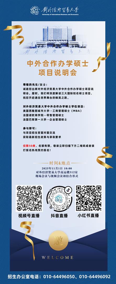 诚邀您参加对外经济贸易大学中外合作办学硕士项目招生说明会,时间2025年11月1日(周六)上午10:00,现场召开+线上同步直播